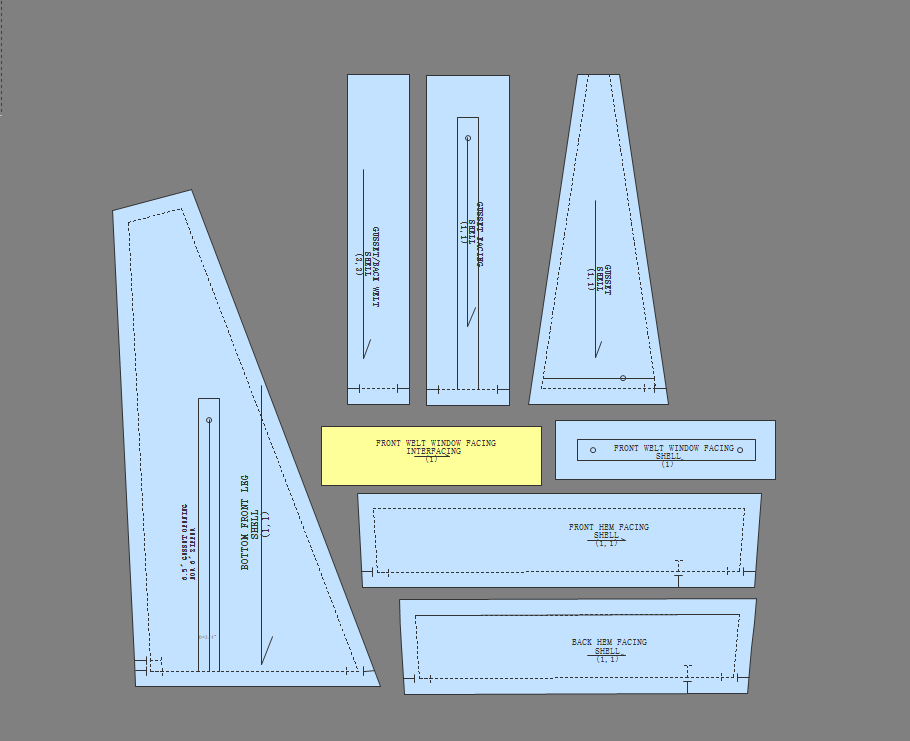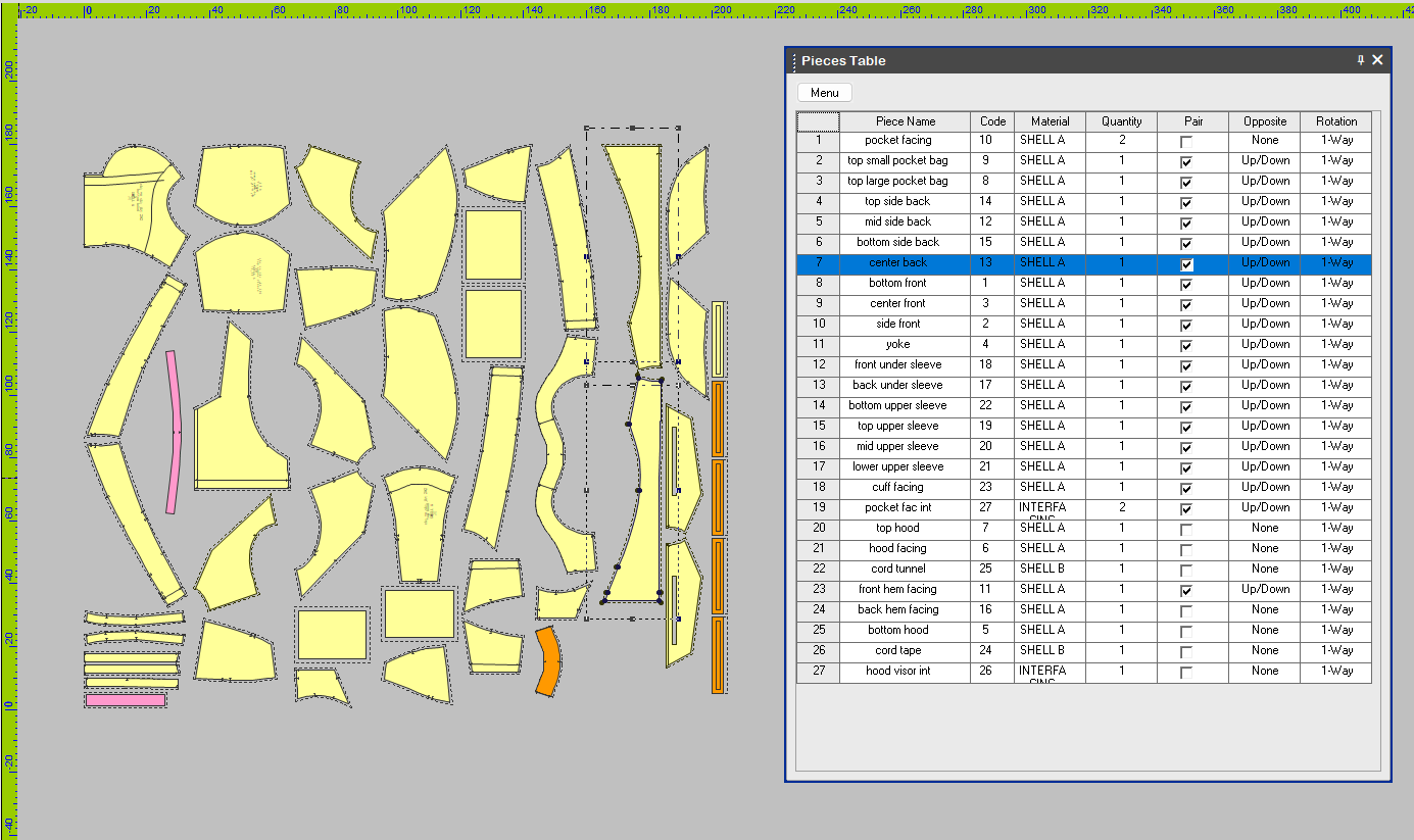 Waterproof Hard Shell patterns and pieces table. 27 pattern pieces and 47 total cut pieces