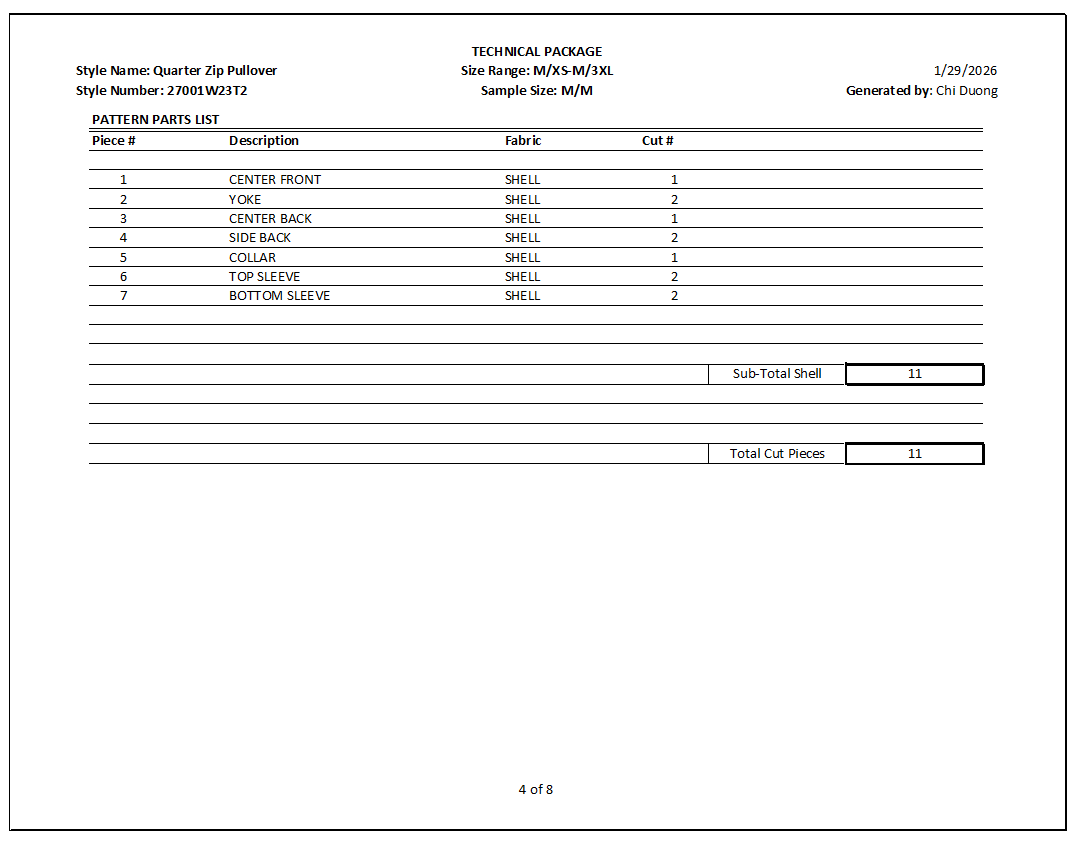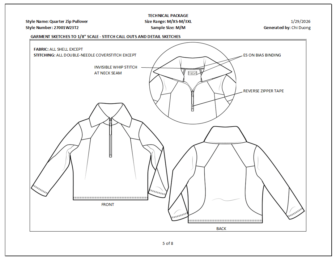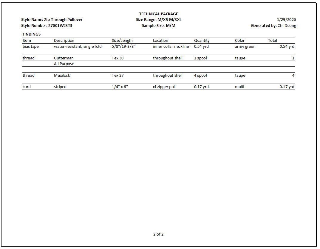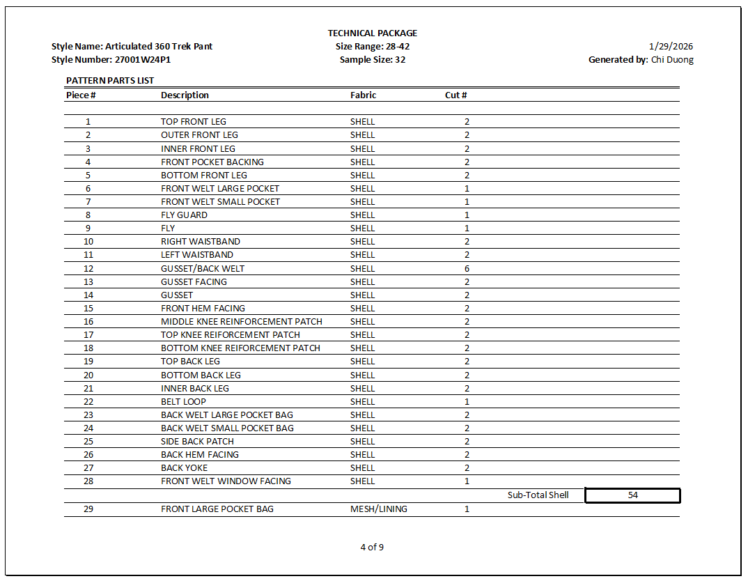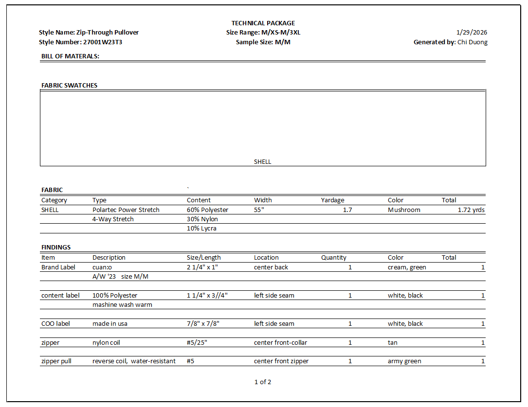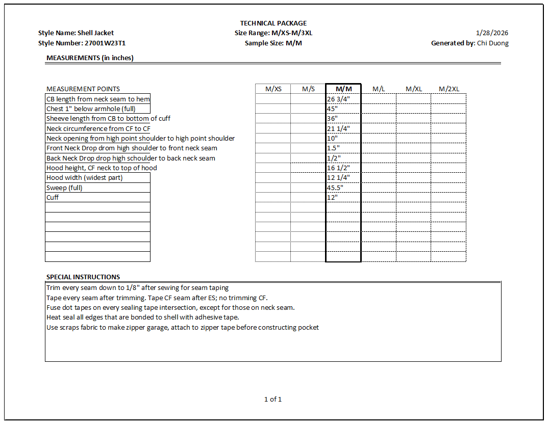 Documentation: Comprehensive Tech Pack developed in Excel.