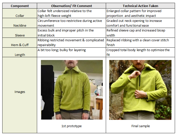 A systematic audit was conducted on Proto 1 to address functional constraints and aesthetic proportions. The transition from a traditional ribbed finish to a technical coverstitch was prioritized to enhance repairability and movement.