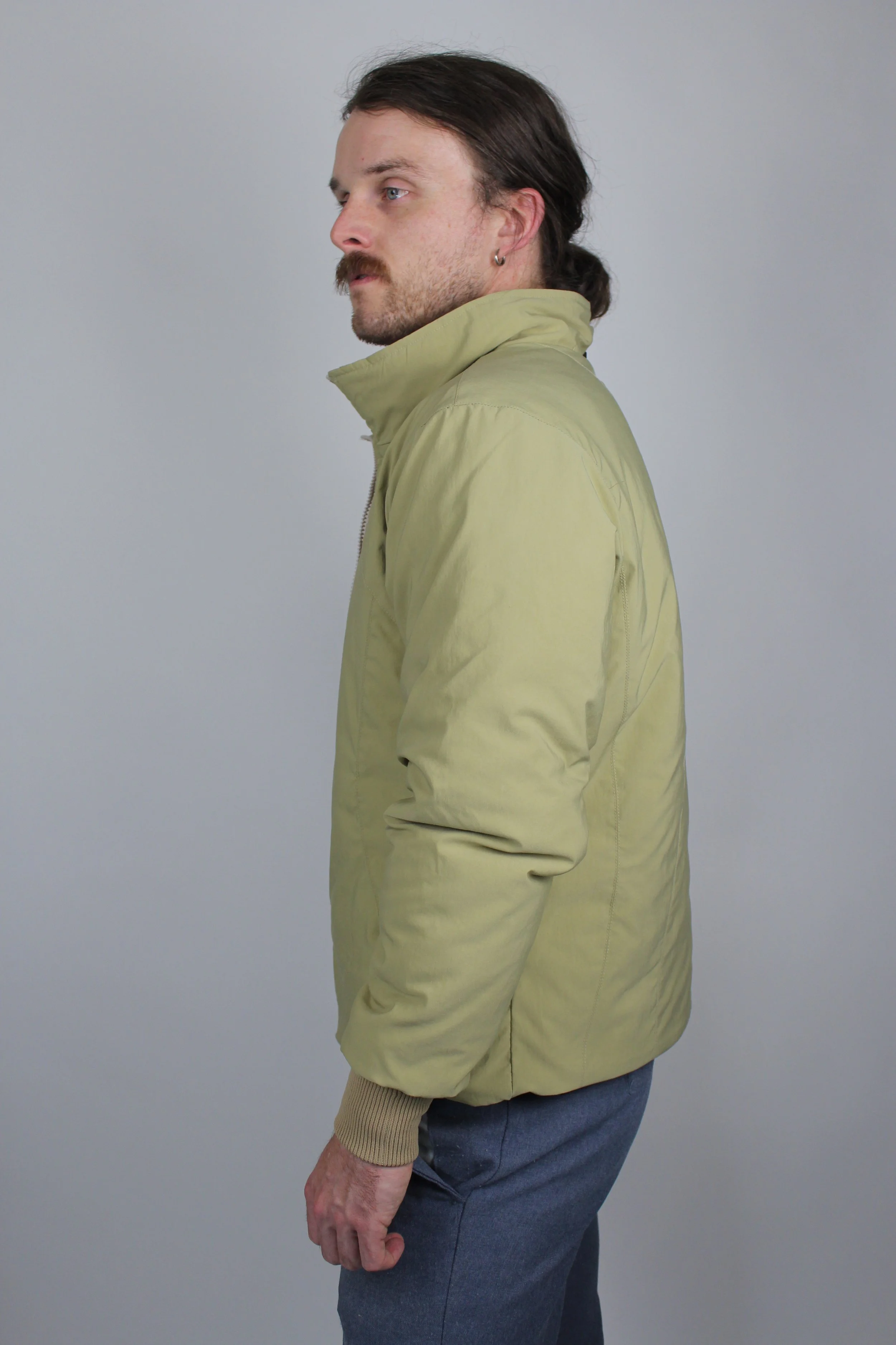 The pairing of Grey-Blue and Yellow-Beige provides visual harmony when the jacket is worn open, balancing the metallic tone of the shell with the organic warmth of the liner. The shell utilizes rectangular design lines to establish a structured look, contrasting with the body-contouring of the liner. Contrasting zipper colors provide a clear visual hierarchy and ease of use.