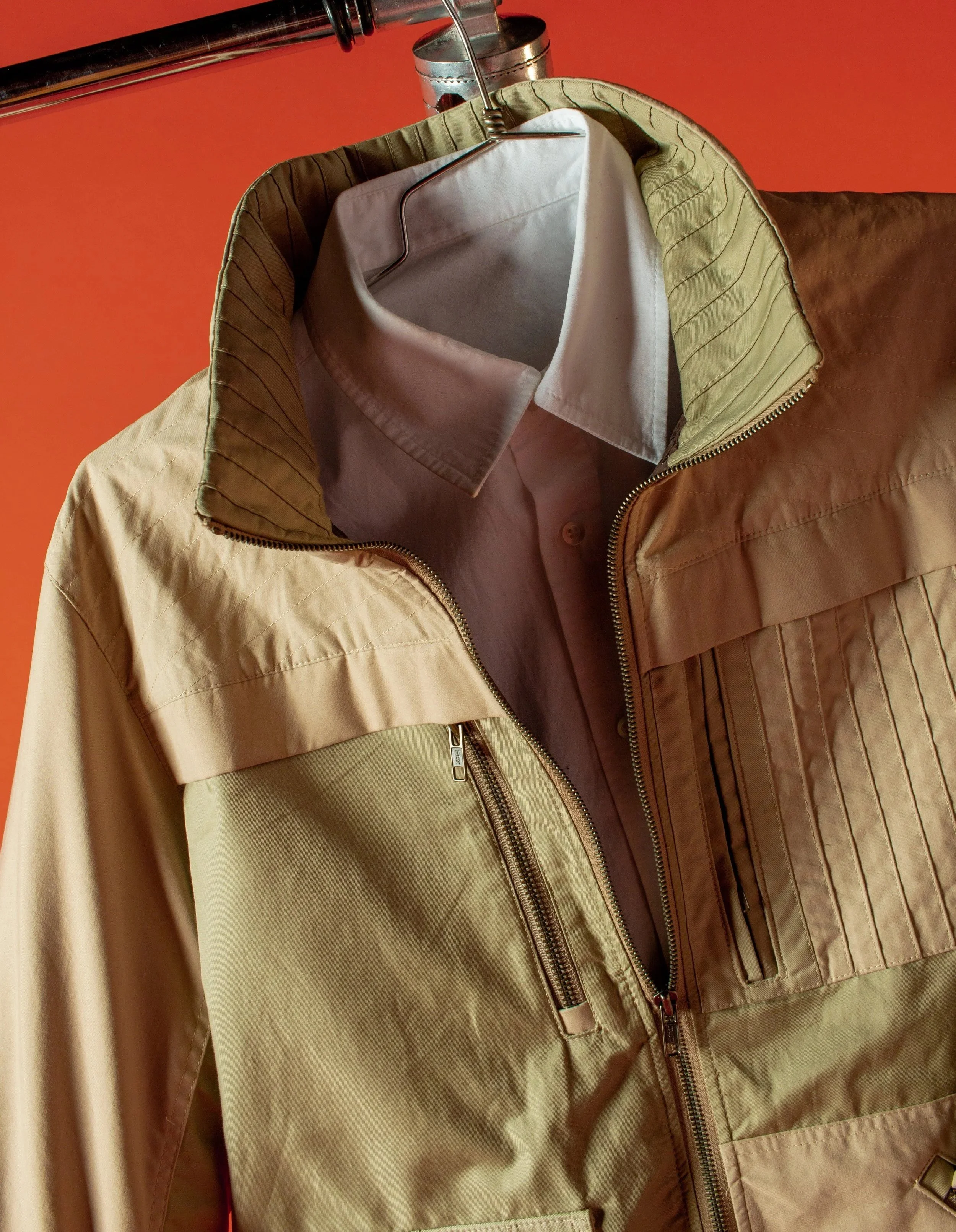 This project uses parallelism and repetitive linear geometry to organize a complex, multi-textured garment. As my first full-scale outerwear project in college, I wanted to balance a dense visual rhythm with a wearable silhouette. I chose a color palette based on a safari landscape: Beige for the arid sand, Pea Green for the savanna vegetation, and varying Brown tones representing the soil. The quiltlines, pleats, and pin tucks act as a structural grid, tying these different materials and colors together into a single, cohesive system.